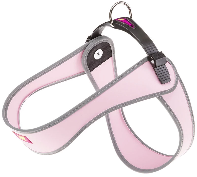 Quality ergonomic shaped harness with easy fit micro regulation fastening system. Features a reflective edge. Available in white, pink and black. 37-45cm