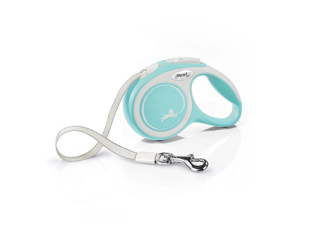 flexi New Comfort Perfectly designed retractable dog lead with tape for medium sized dogs. Superior range model. Very comfortable to hold. Ergonomic and simultaneously adjustable soft grip handle (size M and L) with a smooth surface. Can be customized and works seamlessly with flexi Multi Box and LED Lighting System (see accessories section). Quick-stop braking system.