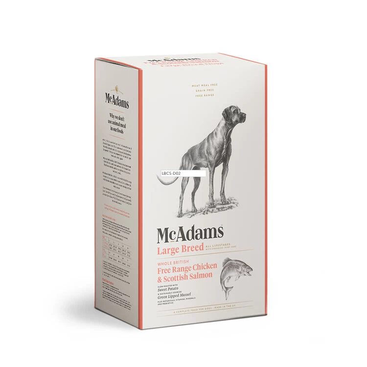 McAdams Free Range Chicken & Salmon Large Breed is a natural and grain free diet that is slow roasted and oven baked using the highest quality meat sources; Whole British Free-Range Chicken and sustainably sourced Scottish Salmon Fillets. This food has been designed for all life stages has increased levels of Green Lipped Mussel to help support and promote the health of large breed dogs’ joints.