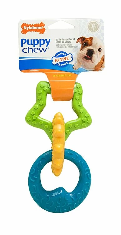 Nylabone Puppy Teething Rings is an interlocked set of 3 ring shapes.