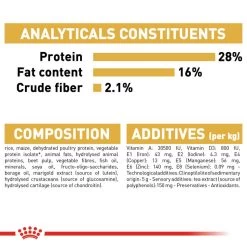 Ingredients: Rice, maize, dehydrated poultry protein, vegetable protein isolate*, animal fats, hydrolysed animal proteins, beet pulp, vegetable fibres, fish oil, minerals, soya oil, fructo-oligo-saccharides, borage oil, marigold extract (source of lutein), hydrolysed crustaceans (source of glucosamine), hydrolysed cartilage (source of chondroitin). *L.I.P.: protein selected for its very high digestibility.