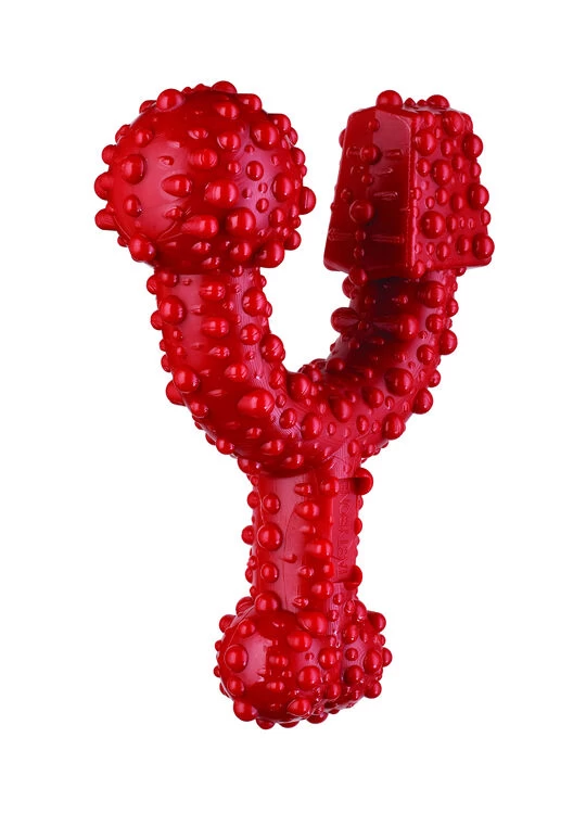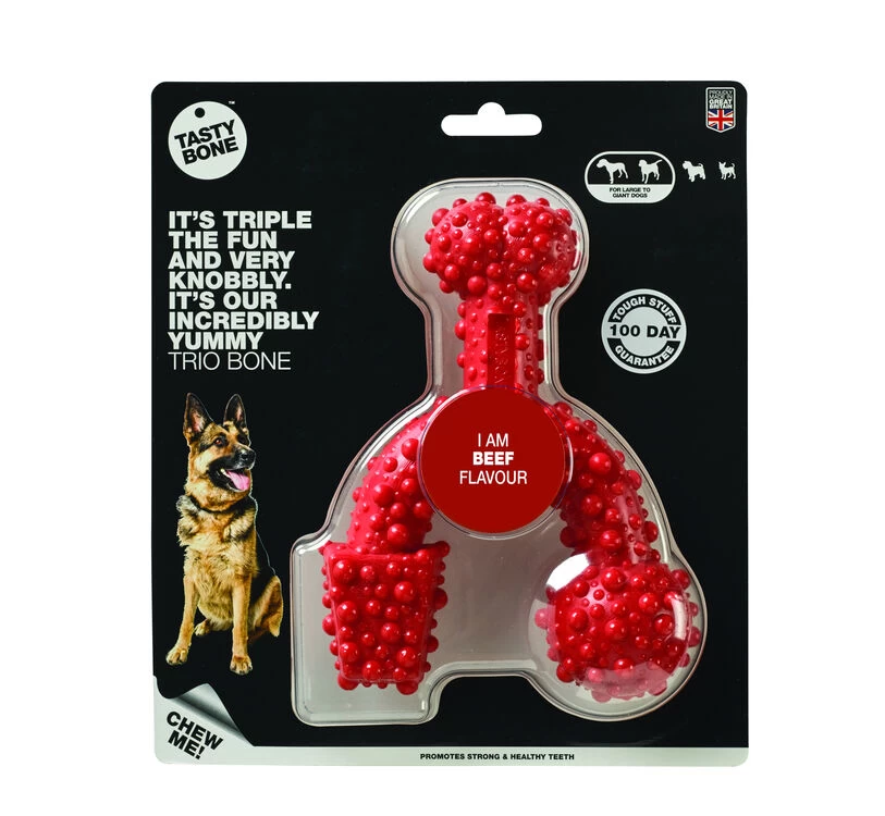It’s triple the fun and very knobbly. It’s our incredibly yummy Trio Bone. Like all of our nylon chews, this TastyBone product has been tested on the most vigorous of chewers. Made from 100% virgin nylon, it is guaranteed to last. Uniquely infused with irresistible flavours right through to the core, your dog will never get bored, as the flavour will last for the lifetime of the bone. With every bite your dogs gums and teeth become stronger and healthier, protecting against infections, tooth loss and vets fees. This bone has a lip-smackingly delicious Beef flavour and is designed for toy, small and large dogs.